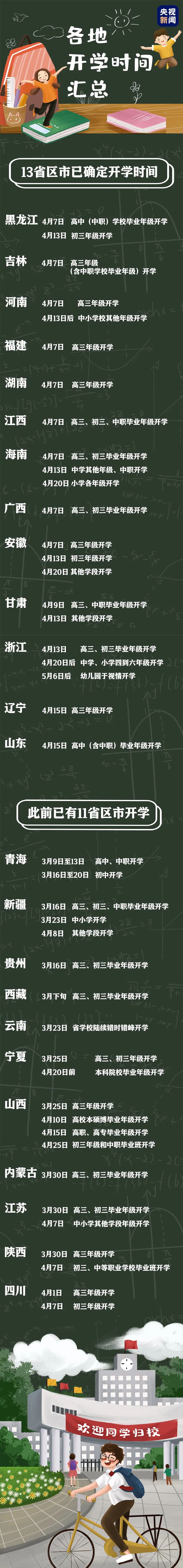 綜合各省區(qū)市教育廳官網(wǎng)消息發(fā)現(xiàn),黑龍江、吉林、河南、安徽、福建、江西、海南、廣西、湖南等9地的高三年級于今日(4月7日)開學。此外,甘肅高三年級將于4月9日開學;浙江高三年級將于4月13日開學;遼寧、山東兩省高三年級將于4月15日開學。