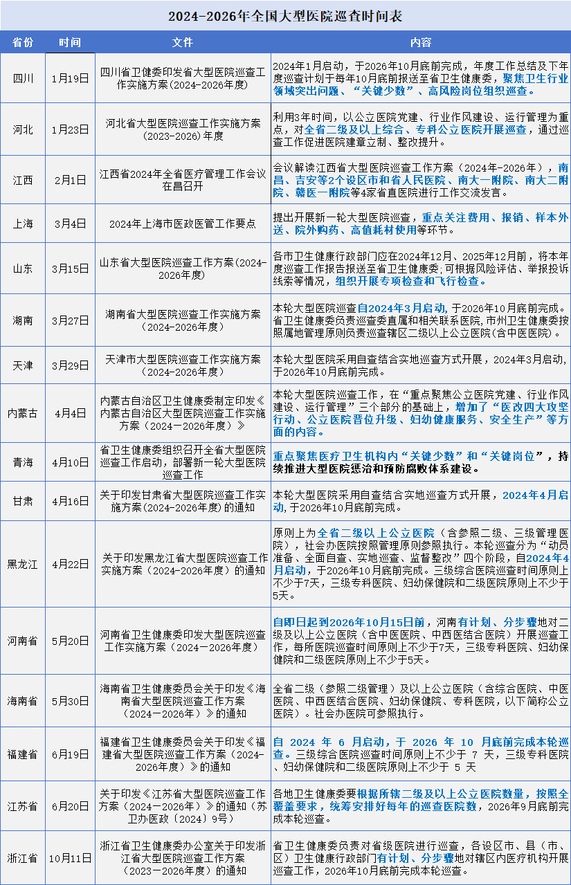 據(jù)聯(lián)盟不完全統(tǒng)計,目前已有16省跟進(jìn)并發(fā)布大型醫(yī)院巡查工作方案,具體包括四川、河北、江西、上海、山東、湖南、天津、內(nèi)蒙古、青海、甘肅、黑龍江、河南、海南以及福建江蘇和浙江,超百家大型醫(yī)院被納入省級巡查的重點名單之中(名單見文末)。