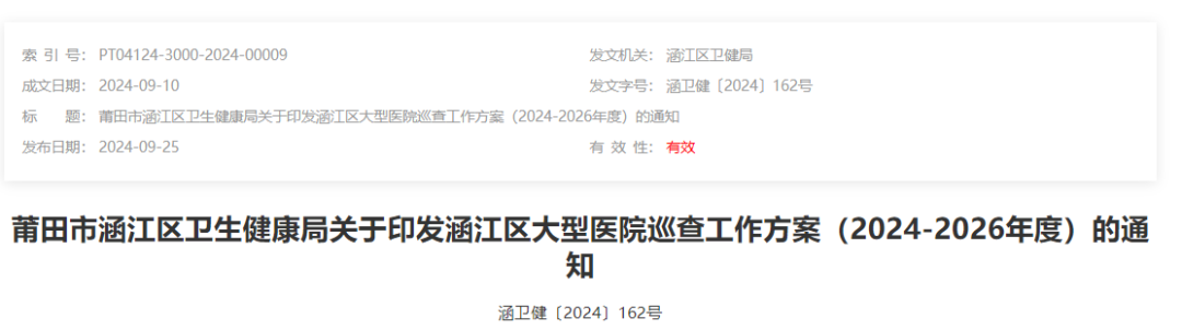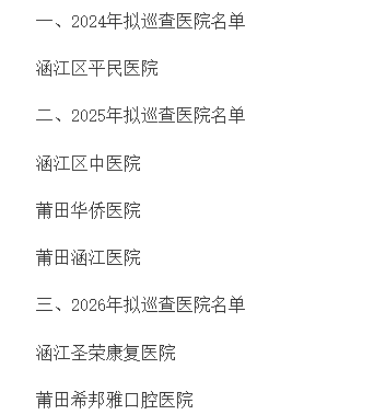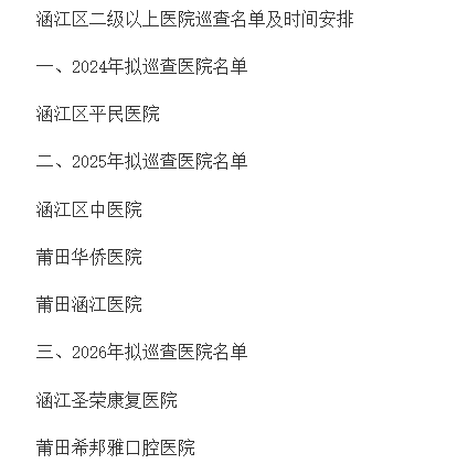 9月25日,莆田市涵江區(qū)衛(wèi)健局印發(fā)《涵江區(qū)大型醫(yī)院巡查工作方案(2024-2026年度)》的通知,公布了擬巡查的醫(yī)院名單和巡查計劃時間安排。