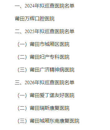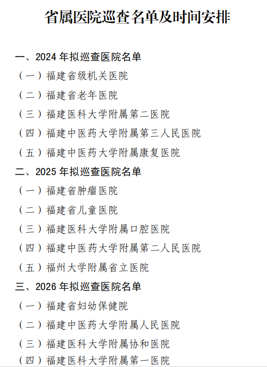涵江區(qū)本次巡查范圍為二級及以上公立醫(yī)院(含中醫(yī)醫(yī)院),巡查自2024年9月底啟動,于2026年8月底前完成,其中三級綜合醫(yī)院巡查時間原則上不少于7天,二級醫(yī)院原則上不少于5天。