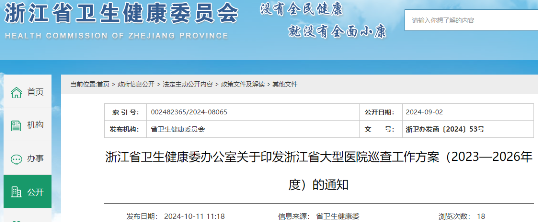 10月11日,浙江省衛(wèi)健委發(fā)布了《浙江省大型醫(yī)院巡查工作方案(2023—2026年度)》的通知,標(biāo)志著全省新一輪大型醫(yī)院巡查工作拉開帷幕。