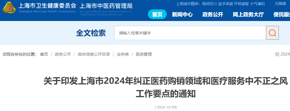 10月9日,上海市衛(wèi)健委公布了由14個部門聯(lián)合印發(fā)的《上海市2024年糾正醫(yī)藥購銷領(lǐng)域和醫(yī)療服務(wù)中不正之風(fēng)工作要點》,其中也提出將開展大型醫(yī)院巡查工作。